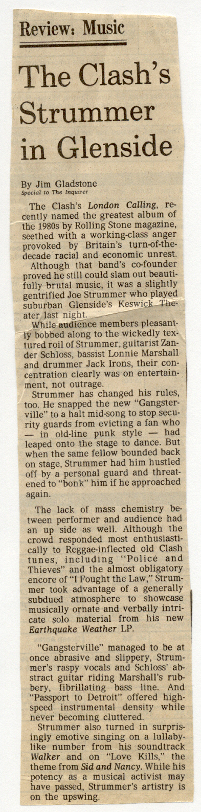 | I saw Joe on the Earthquake Weather tour on Friday, Nov. 10, 1989, in Trenton, NJ at City Gardens, an old-school punk club about an hour or two from NYC. I think a local band opened. In a notebook I kept at that time I scribbled down some songs he played: "Gangsterville," "King of the Bayou" (I remember folks laughing at the line "She'll just say we were drunks who couldn't make her come"), "London Calling," "Police & Thieves," "What's My Name," and "I Fought the Law." I also noted that I didn't know a lot of the songs he played; he could have done more from "London Calling" but since at that time I had only the first two Clash albums I wouldn't have known it. I also remember people calling for "White Riot" and he said "I'm sorry, I hear your request but I can't play that song," very seriously. I got there early and Joe walked right by me in the dark club; I could see the oil glisten in his hair and noticed he was wearing an intricate Western shirt. I said, "Hey Joe!" but he had his eyes closed, just nodded, said, "Right, right!" and kept going. | ||
